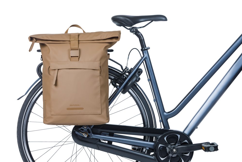 Basil Fietsschoudertas Brooklyn MIK Hooks, 17L, gerecycled PET, waterdicht hoofdvak, waterkerende vouwsluiting met gesp, binnen- en buitenvakken, laptopvak 16 inch, afneembare schouderband, helmbevestiging, handgreep, reflectie