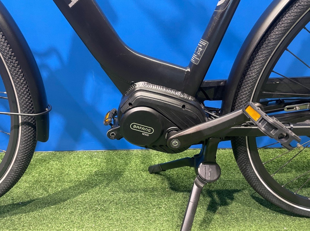 Cortina elektrische fiets Common Dames 57cm, Jet Black Matt, Shimano Nexus 7 versnellingsnaaf , Rollerbrakes voor en achter, Bafang MM300 43V systeem met middenmotor.